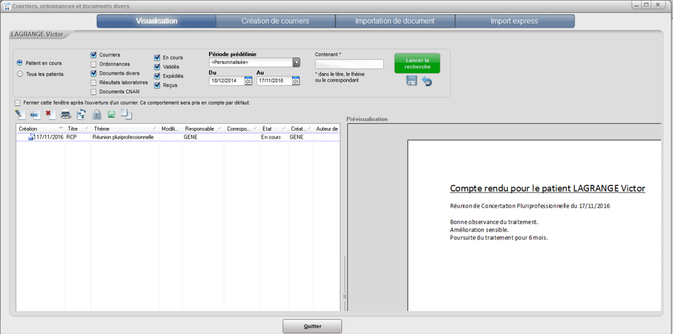 En parallèle un document a été généré pour chaque compte rendu patient rédigé. Vous retrouvez ce document dans la gestion des courriers du patient, avec pour titre RCP et pour thème Réunion pluriprofessionnelle. ![]() Si vous modifiez le compte rendu depuis l'écran de gestion de courriers du patient et que vous sauvegardez vos modifications, celles-ci seront prises en compte dans le compte rendu de la réunion. |