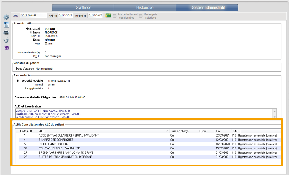 L'intégration des Affections Longue Durée est bien effectuée, elles apparaissent dans le dossier administratif du patient.
